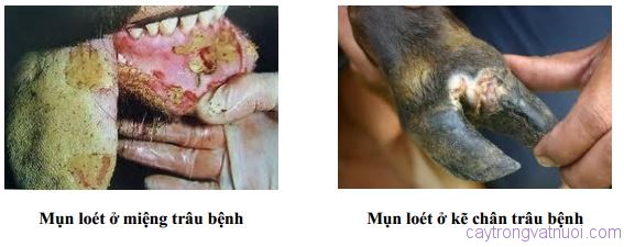 Sau khi sốt 2-3 ngày, xuất hiện các mụn nước ở mõm, lưỡi, môi, miệng, lỗ múi và giữa các ngón chân và móng…Khi mụn to vỡ ra tạo vết loét làm con vật đau đớn, đi lại, ăn uống khó khăn. Ở thể nặng con vật bì què, gây bong tróc móng chân, không thể đứng được nên hay nằm, miệng đau không lấy thức ăn được, lâu ngày dẫn đến kiệt sức và gây chết.