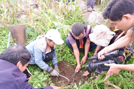 Lãnh đạo TT và đồng bào kiểm tra mẫu thử để đánh giá sự phát triển của củ Đảng sâm (14 tháng tuổi)