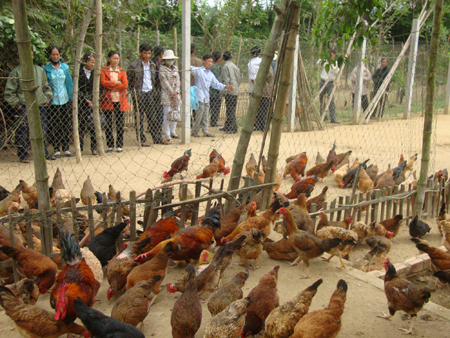 - Với tỷ lệ nuôi sống đến xuất bán là 90% thì mô hình cho tổng thu 270 triệu đồng/1.800 con gà (giá bán cao hơn, bình quân 100.000 đồng/kg vì chất lượng thịt dai, da vàng, thơm ngon hơn so với gà ngoài mô hình). Trong khi đó gà nuôi của các hộ ngoài mô hình tỷ lệ sống trung bình là 85% thì cho tổng thu 217 triệu đồng/1.700 con gà (giá bán 85.000 đồng/kg vì chất lượng thịt mềm, không thơm và da không được màu vàng,..). Như vậy tổng thu của mô hình cao hơn gấp 1,25 lần so với ngoài mô hình.