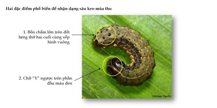 - Trên trán sâu non tuổi lớn nhìn rõ hình chữ Y ngược màu vàng, mặt lưng màu đen với lông cứng dài. Trên mặt lưng đốt bụng cuối có bốn đốm đen được sắp xếp thành hình vuông (trong khi các đốt khác có 4 đốm đen xếp thành hình thang).