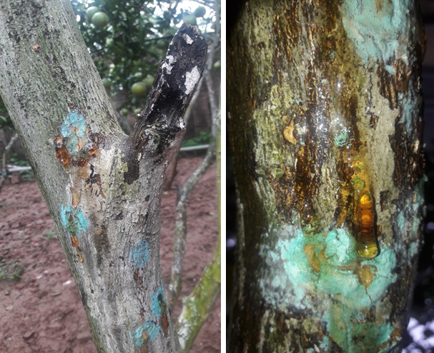 Bệnh do nấm Phytophthora Citrophthora. Hiện tượng chảy nhựa trên cây có múi xảy ra quanh năm, bệnh thường phát triển chậm cây bị chết có biểu hiện vàng lá, khô cành, trường hợp bị nặng có thể chết cả cây. Bệnh phát triển mạnh vào mùa mưa, bào tử nấm phát tán, lây lan nhờ nước. Vào thời kỳ quả chín, bệnh thường phát sinh gây hại rất nhanh, đặc biệt là khi gặp điều kiện mưa nhiều, vườn cây quả rậm rạp kém thông thoáng. Bệnh hại quả cây có múi thường gặp nhất là ở cam, chanh.