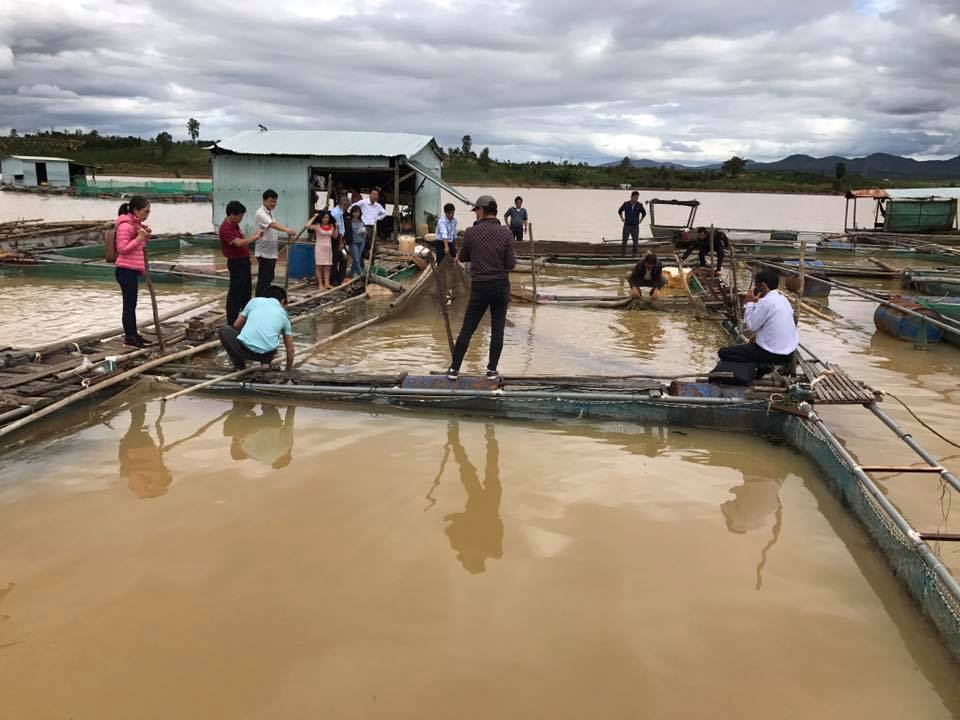 Đại biểu tham quan mô hình Nuôi cá thát lát cườm lồng bè trên sông hồ gắn với tiêu thụ sản phẩm, tại hồ thủy điện Ia Ly- xã Ia Phí, huyện Chư Păh, tỉnh Gia Lai của chủ hộ Vũ Văn Khoa. Ảnh: Phan Văn Bách