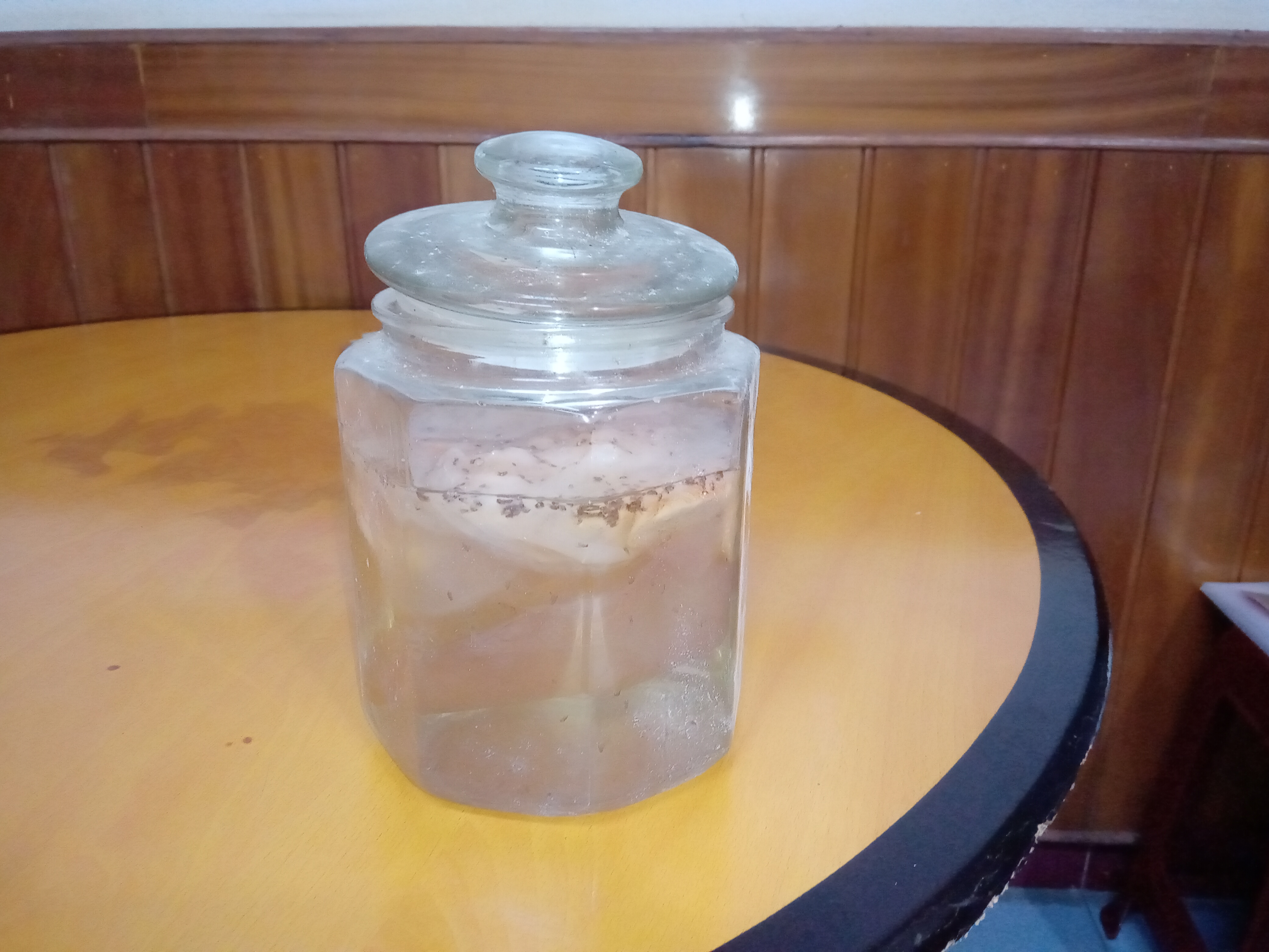 Lấy một con giấm ở hũ cũ (mình tách lấy lớp mỏng thôi vì ở hũ cũ nó đã lên dày) pha nước đường với công thức trên rồi cho 1,2 miếng chuối cắt lát vào hũ;