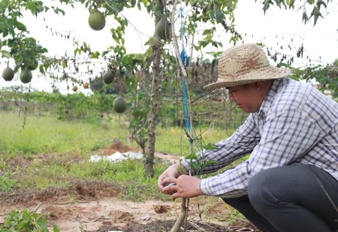 | Anh Hiệp khuyến cáo, sau mỗi vụ thu hoạch bà con nên cắt gốc, chỉ để lại 10 - 15 cm để cây nảy mầm ra những dây mới, đồng thời cắt ghép các giống gấc lai vào gốc gấc cũ. Trong thời gian gấc chưa leo giàn, có thể tận dụng diện tích để trồng xen canh một số loại rau màu ngắn ngày để kiếm thêm thu nhập. |
