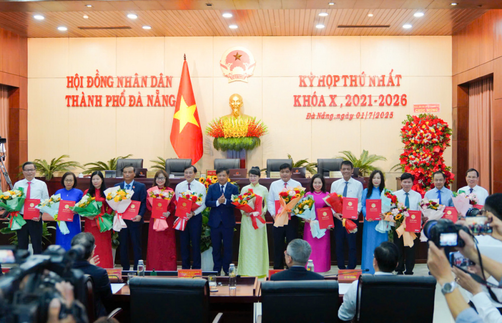 Đ/c Lương Nguyễn Minh Triết - Ủy viên dự khuyết Ban Chấp hành Trung ương Đảng khóa XIII, Chủ Tịch UBND TP. Đà Nẵng trao quyết định, tặng hoa chúc mừng 14 giám đốc sở ban ngành tại kỳ họp.