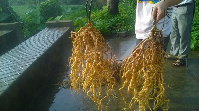 Thu hoạch toàn bộ rễ. Sau trồng Ba kích từ 4 năm trở lên có thể thu hoạch rễ. Thu hoạch tốt nhất vào tháng 12 và tháng 1. Trước khi thu hoạch rễ nên hái quả để làm giống.